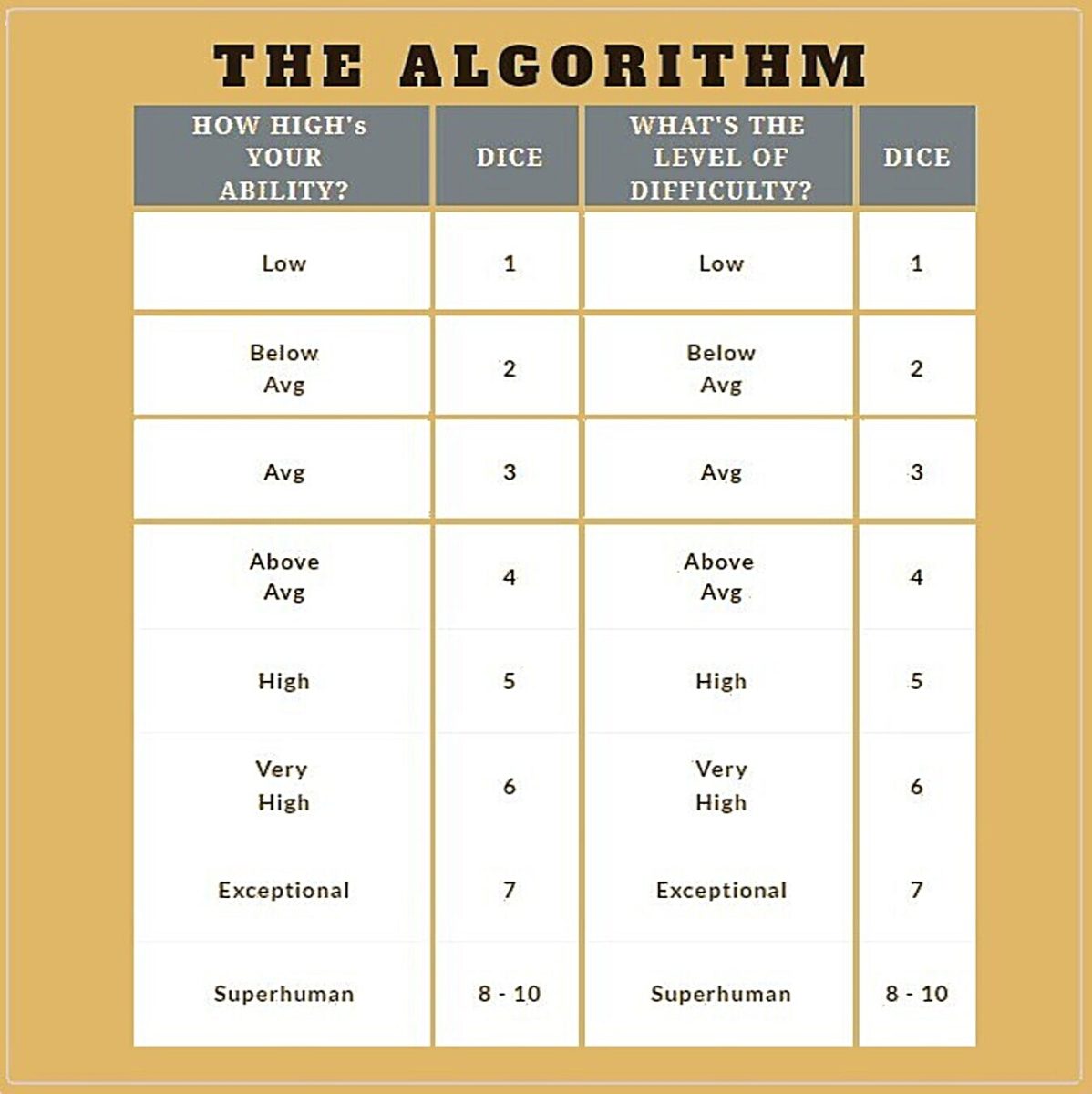 THIS IS ALSO THE NUMBER OF DICE TO BE ROLLED WHEN ATTEMPTING TO DO ANYTHING AND THE NUMBER OF DICE THE WORLD (The DM) OR YOUR OPPONENT WILL ROLL AGAINST YOU